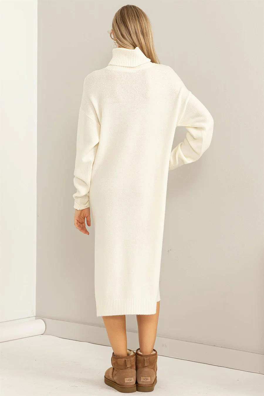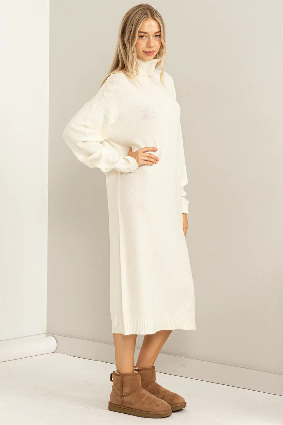 Long-Sleeved Midi Dress with a Ribbed Turtleneck and Drop Shoulder.