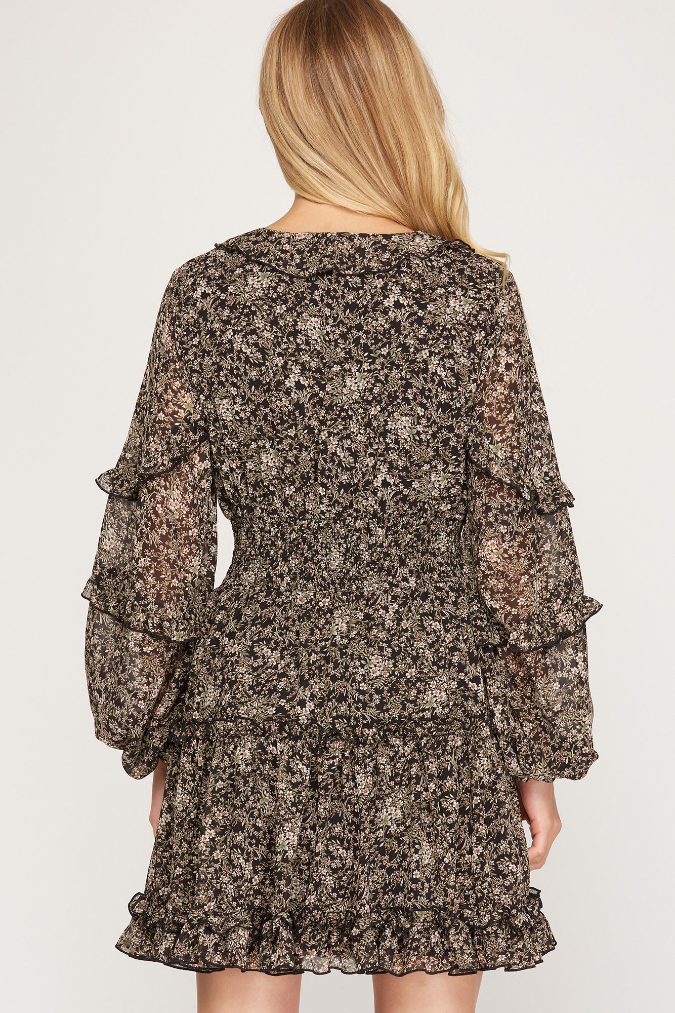 Long-Sleeve Printed Dress with Smocked Waist and Ruffled Sleeves.