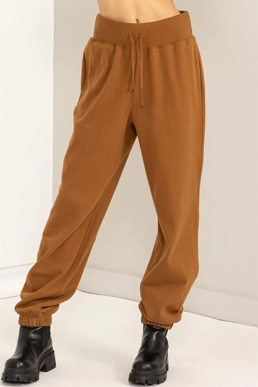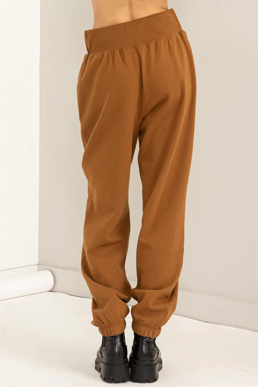 High-waisted sweatpants with a Wide Waistband and Cinched Bottoms.