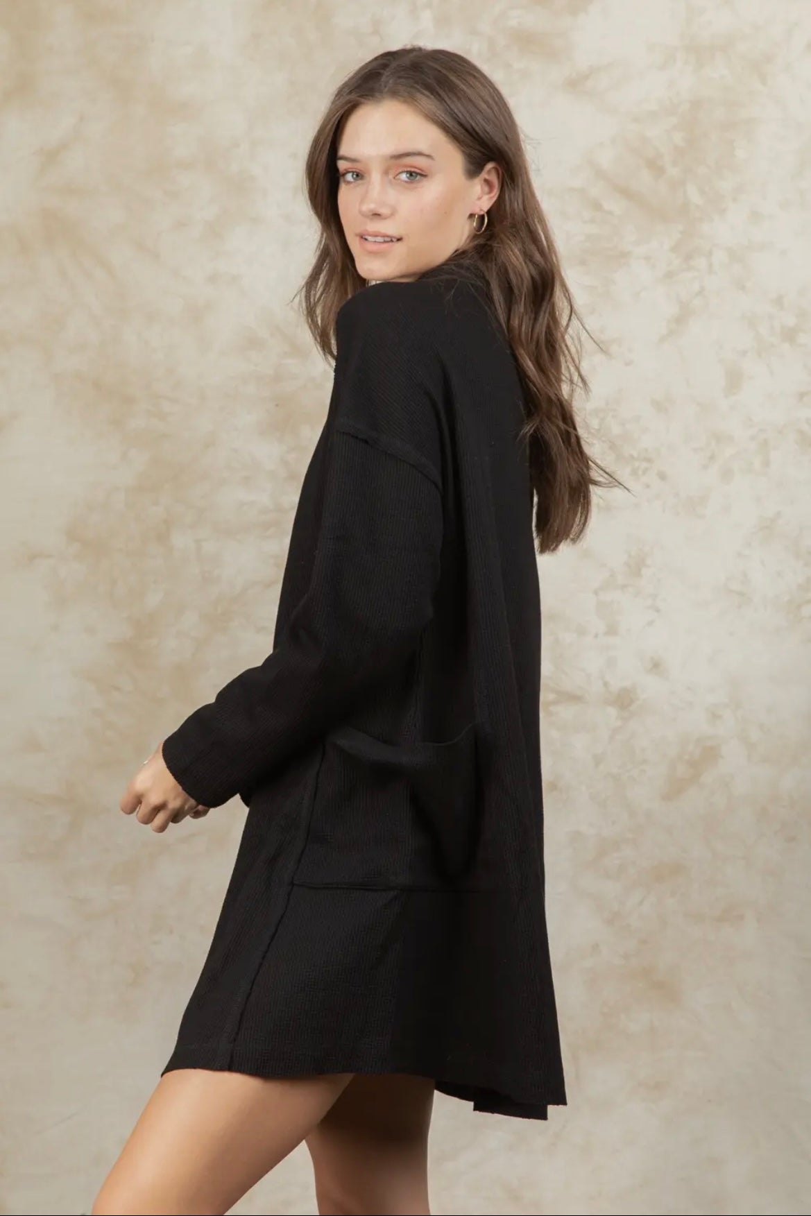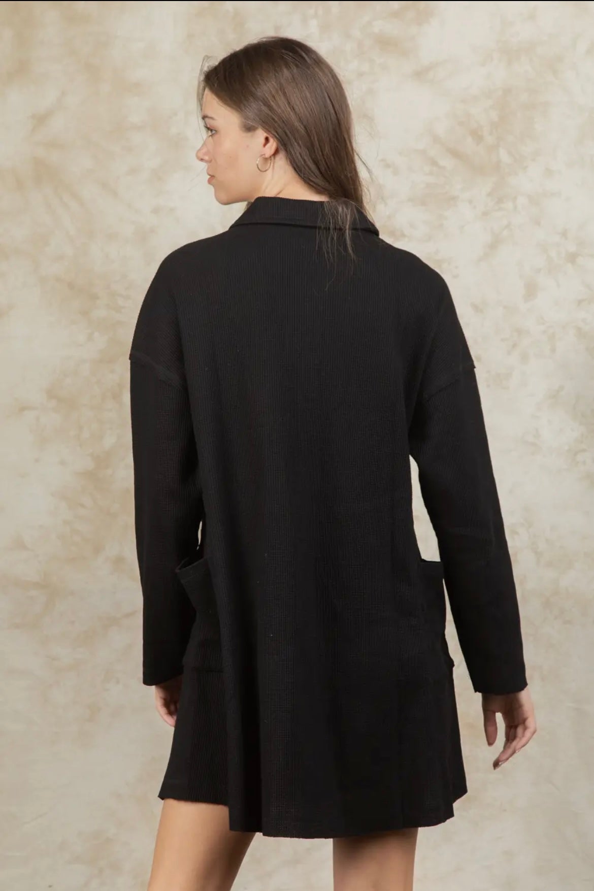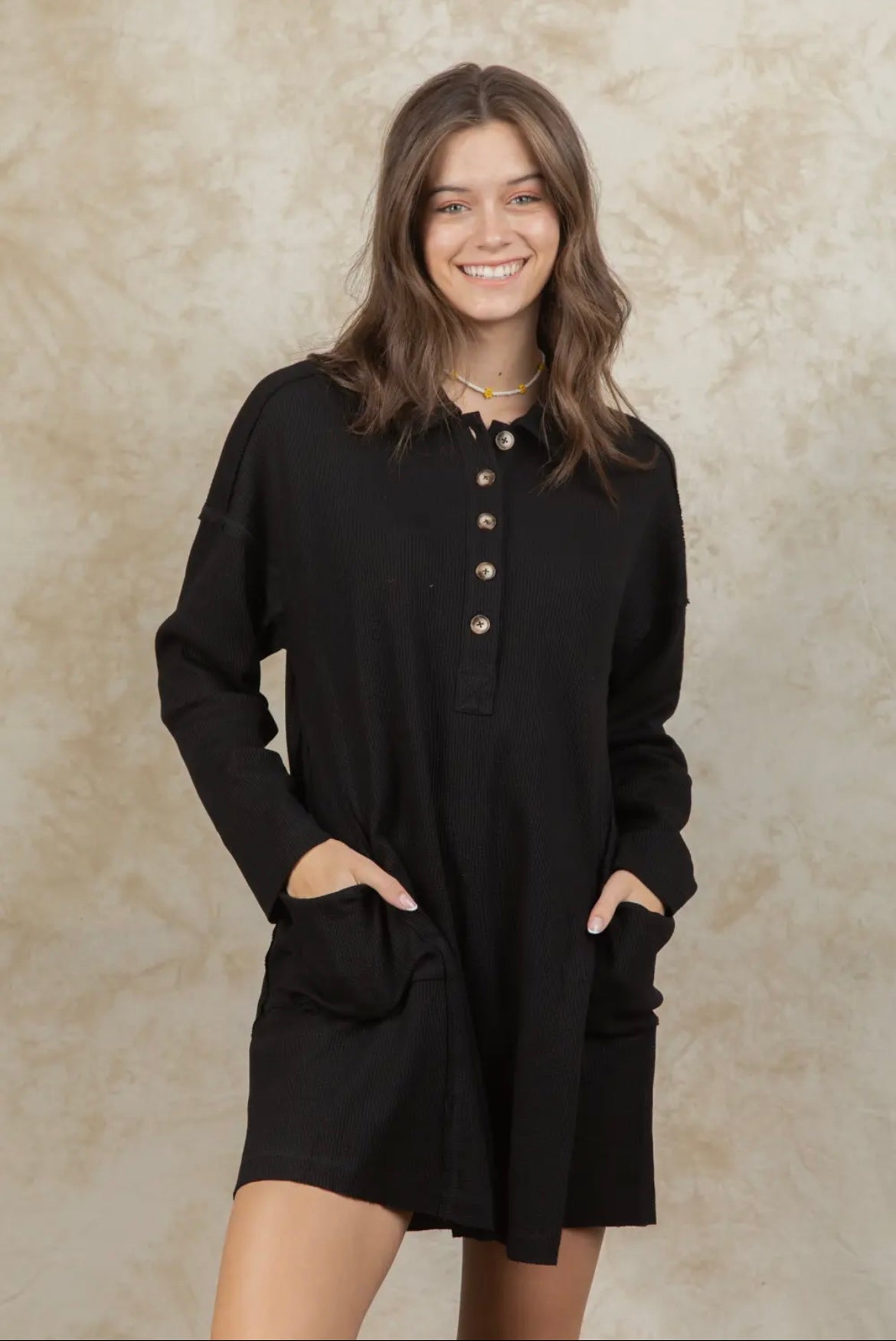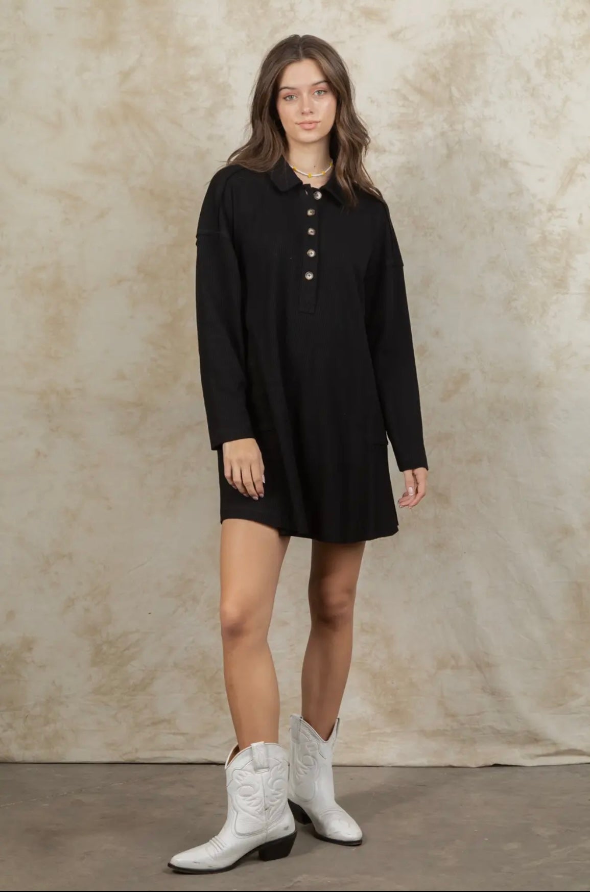 Causal Shirt Collared Solid Knit Mini Dress. This dress has functional Henley Buttons and pockets on the side.