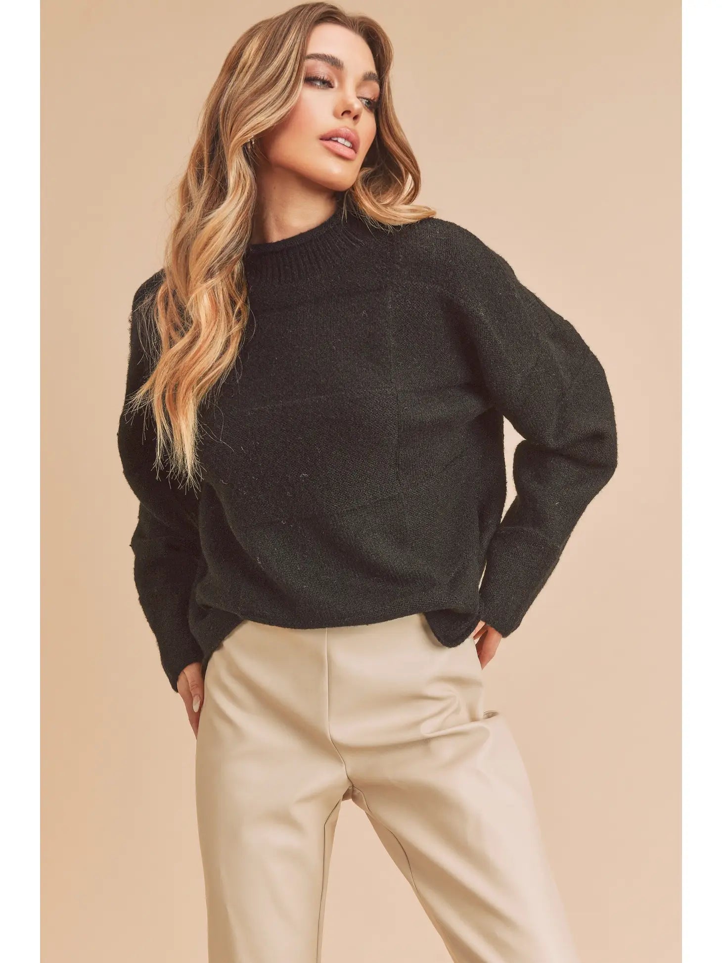 Mock neck sweater with mixed patchwork pattern.